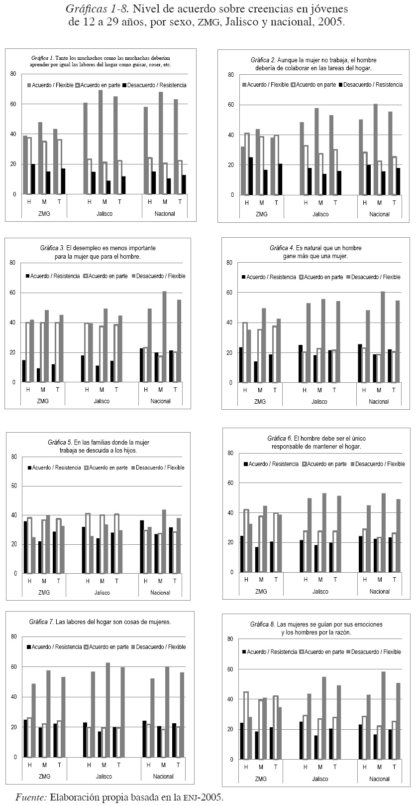 Entre las poblaciones estudiadas existen variaciones en la proporción de jóvenes que adoptan posiciones de resistencia y de flexibilidad. La mayor flexibilidad en las distintas creencias se encuentra en la población a nivel nacional y disminuye progresivamente en Jalisco y en la ZMG; esta última muestra la mayor resistencia en la adopción de posiciones flexibles en los papeles de género. Un aspecto que convendría analizar es la relación entre las creencias y los procesos de secularización y el conservadurismo, que con mucha probabilidad están imbricados y que además tienen mayor o menor fuerza en las distintas regiones del país. Como es bien sabido, la población de la ZMG ha sido catalogada como conservadora.13 En este sentido, conviene tener presente que es esta población la que presentó los porcentajes más elevados de respuestas "acuerdo en parte" tanto en hombres como en mujeres.