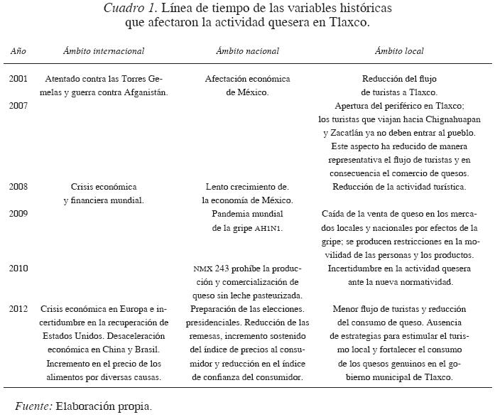 Las queserías y cremerías reconocen de manera general un descenso en la producción quesera de Tlaxco y de manera particular la desaparición del queso tenate; esta problemática se ha hecho más evidente en los últimos cinco años. Algunas causas del decaimiento se explican en la línea de tiempo del cuadro 1.
