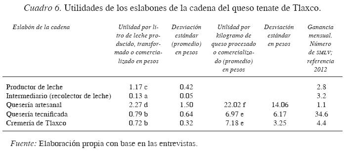 La utilidad que produce la quesería tecnificada se estima en un promedio mensual de 60 248 pesos; este valor corresponde a 34.6 salarios mínimos legales vigentes de 2012 (tomando como referencia 1 740 pesos mensuales). Aunque las utilidades por litro de leche procesada y kilogramo de queso elaborado por las queserías tecnificadas es inferior al valor obtenido por las artesanales, las economías de escala que han implementado las primeras hacen posible que sus utilidades sean 31.5 veces mayores que las obtenidas por las queserías artesanales de Tlaxco.