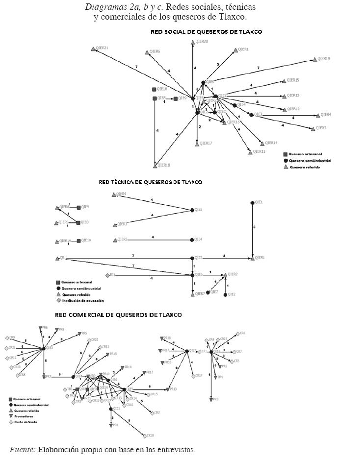 Los anteriores diagramas muestran varios elementos. Por una parte, se reconoce la desarticulación que existe entre los queseros artesanales y los tecnificados, el alto aislamiento técnico y social de los queseros artesanales, y el establecimiento de vínculos sociales basados en las relaciones de parentesco y consanguinidad (Cristina Zamora y Clara García, Pablo y Martín Albuquerque hermanos, Juan Bernardo y Lucio Escalante hermanos). Las demás relaciones sociales de los queseros tecnificados se estructuran a raíz del interés en el establecimiento por el precio de la leche. Los queseros artesanales concentran las relaciones comerciales en el municipio de Tlaxco; esto se debe a que los proveedores y clientes (sólo venta directa) se ubican en ese lugar.