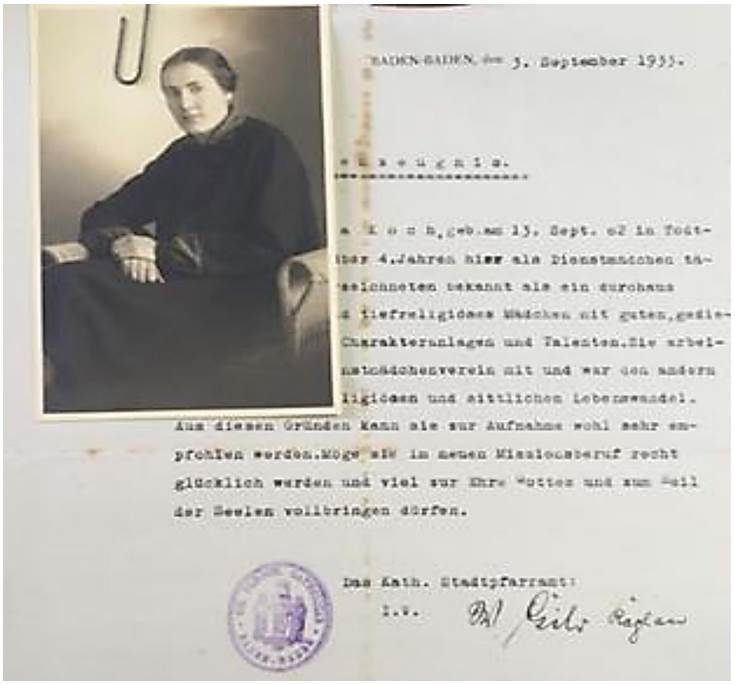 I do not want to hide that I was already a candidate at the home of the Sisters of the Holy Cross in Altötting [...] I was dismissed from there for once expressing that I had insomnia at night. They took that statement so seriously [...] I still regret very much today having made that statement in my sincerity at the time [...] My most fervent desire is to be able to work soon in foreign missions and I will not stop praying for this great grace (Margareta Maier, 1934, AHDV).26