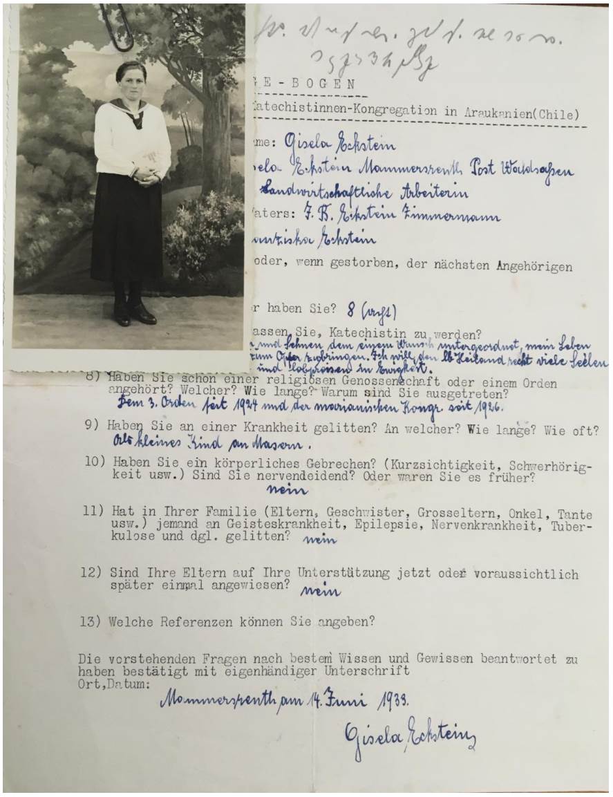 Some of the questions from the questionnaire attached to the application are also interesting to highlight: “What are the reasons that lead you to want to be a catechist?”, “Physical disabilities (myopia, deafness, etc. Do you suffer from nerves? Or have you suffer from them previously?)”, “Mental illnesses or others (epilepsy, nervous diseases, tuberculosis) of direct family members”, “Current or future dependence on your parents” (“Fragebogen für Bewerberinnen zur Katechistinnen-Kongregation in Araukanien (Chile)”, n/d, AHDV).