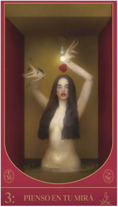 Uno de los gestos visuales más potentes del video es el cruce de Rosalía a través de un espejo. Esta acción tiene un doble significado: por un lado, funciona como umbral simbólico, en línea con la idea de paratexto visual de Genette (2001), y, por otro, como reflejo roto o espejado del yo. Aquí resuena la figura del espejo roto del artwork de “Pienso en tu mirá”, ahora reformulada como pasaje simbólico. Desde la perspectiva de Mitchell (2005), este gesto no es solo decorativo: las imágenes “actúan”, modifican el estatus perceptivo del sujeto. Cruzar el espejo implica atravesar la imagen, volverse imagen activa.