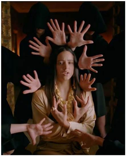 Finalmente, en los momentos culminantes del video, Rosalía ejecuta una secuencia de movimientos que Baixauli (2019) interpreta como una coreografía de ataque histérico, retomando gestualidades asociadas históricamente a la irracionalidad femenina. Sin embargo, desde una lectura contemporánea, este gesto se resignifica como afirmación del cuerpo y de su potencia simbólica. En línea con Jones (1998), este estallido performativo puede entenderse como acto de reapropiación de los afectos tradicionalmente patologizados.