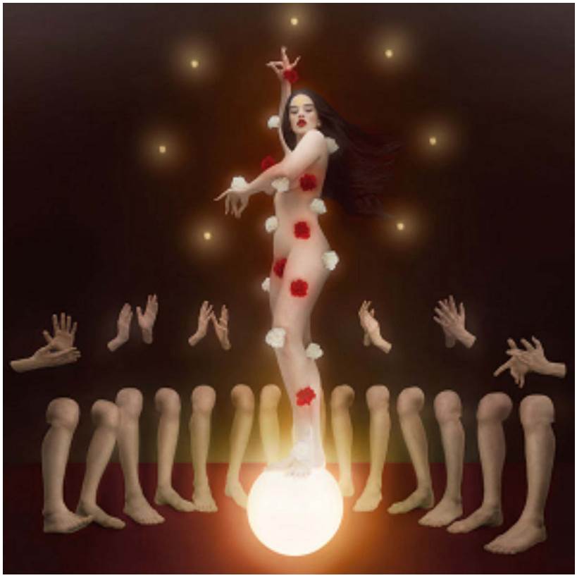El artwork de “Di mi nombre” representa a Rosalía en una postura que remite al baile flamenco, posicionada sobre un sol y adornada con rosas rojas y blancas (Figura 9). A su alrededor, siete estrellas o puntos de luz conforman una especie de halo que evoca imágenes religiosas, mientras detrás se dibujan seis figuras que aplauden como en un tablao flamenco. Esta imagen concentra múltiples códigos visuales que pueden leerse como supervivencias (Warburg 2010): representaciones de lo sagrado, lo femenino y lo performativo, reapropiadas en clave contemporánea desde un lenguaje visual híbrido entre lo religioso, lo popular y la estética pop.