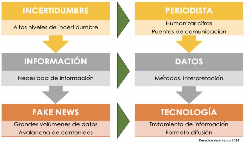 La sistematización de los estudios y fuentes partió de la lógica de acción, es decir, del momento en que ocurre el desastre natural, y el proceso que eso desencadena: 1) aparece la incertidumbre, 2) luego la necesidad de información, 3) se generan las noticias falsas por la avalancha de contenidos originados por el big data, 4) entonces el periodista es el encargado de darle una forma humana a esos datos y crea los puentes de comunicación en las autopistas de información, 5) con ese fin utilizan los métodos y la interpretación de los códigos deontológicos del buen periodismo, y 6) para -finalmente- hacer uso de la tecnología en un formato de tratamiento y difusión de la información. A continuación se ilustran estos conceptos en la Figura 2.