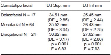 Se encontraron diferencias estadísticamente significativas en la media de la distancia intercanina inferior por somatotipo; la D. intercanina menor correspondió al somatotipo dolicofacial y la mayor al somatotipo braqui severo (Cuadro V).