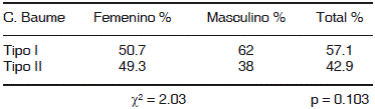 Se encontraron diferencias estadísticamente significativas en la C. Baume en ambas arcadas por género, la C. Baume que predominó en niñas fue la tipo II, mientras que en los niños predominó la Tipo I (Cuadro VI).