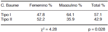 Se encontraron diferencias estadísticamente significativas en la C. Baume en la arcada inferior por género, la C. Baume. La que predominó en niños fue la Tipo I, mientras que en las niñas fue la Tipo II (Figuras 1 y 2).