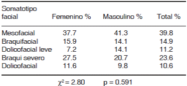 Otras referencias han sugerido que el somatotipo facial se distribuye en la población de una manera específica, como lo demostró Ricketts 13 en una curva de Gauss; sin embargo, nuestros resultados no concuerdan con este concepto, ya que encontramos que la prevalencia del somatotipo facial en niñas se inclinó 18.8% dolicofacial, mesofacial 37.7% y braquifacial 43.5%; en los niños la distribución fue distinta, el 41.3% mesofacial, el 34.8% braquifacial y 23.9%. dolicofacial. Es importante mencionar que la muestra con la que trabajamos fue mucho menor que la que utilizó Ricketts, y los criterios de inclusión fueron diferentes.