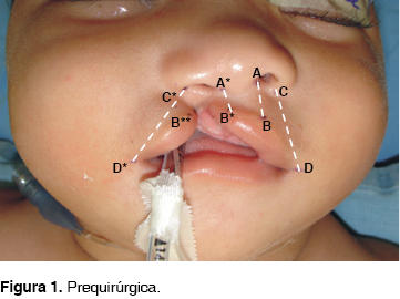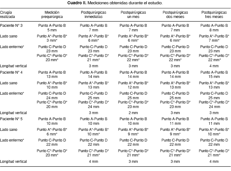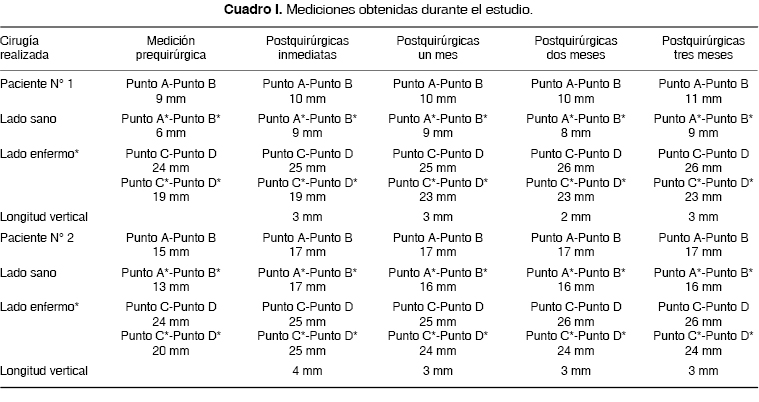 Se realizaron mediciones (Cuadros I y II) uniendo los puntos A-B y C-D tanto en el lado sano como el afectado. Estas mediciones fueron prequirúrgicas y postquirúrgicas inmediatas y control a un mes, dos meses y tres meses.