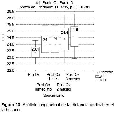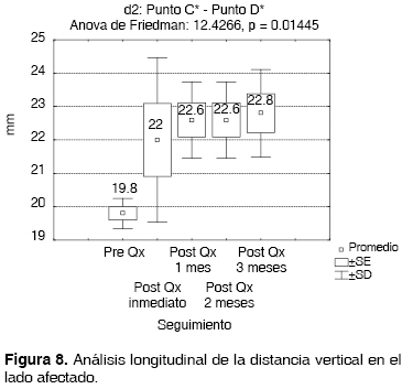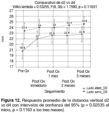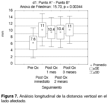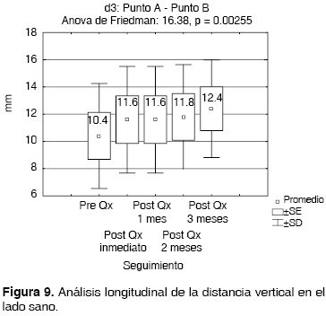 En el análisis comparativo (Figuras 11 y 12) entre d1 = A*-B* y d3 = A-B, se aprecia aproximación considerable de la longitud vertical del lado afectado en relación al sano en el postquirúrgico inmediato, sin embargo esta longitud vertical ganada posterior al mes del procedimiento quirúrgico comienza a disminuir considerablemente, alejándose del resultado obtenido en el postquirúrgico inmediato.