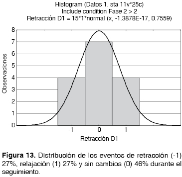 De acuerdo a la distribución de los eventos ocurridos posterior a labioplastia (Figura 13) se observa retracción vertical hasta un 27% con un porcentaje de relajación del 27% y un periodo de estabilidad, es decir, manteniéndose la longitud estable posterior a la retracción hasta un 48%.