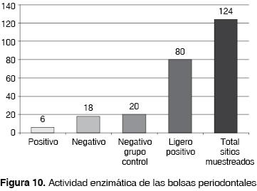 En un total de 72 pacientes observados la totalidad de sitios examinados fueron 124, de los cuales la actividad enzimática se manifestó de la siguiente manera: