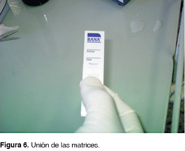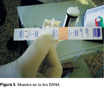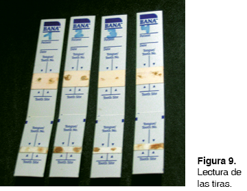 Se colocó la muestra de placa subgingival extraída en la parte inferior de la tira del Test BANA.