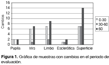 La comparación de los cambios de color que sufrieron las muestras caracterizadas, la realizó un solo observador y observó en las fotografías si hubo cambios o no en pupila, iris, limbo o esclerótica. La observación de los cambios se realizó comparando las fotografías de antes con las de los 30 y 60 días en condiciones de deterioro acelerado, realizándole una gráfica de frecuencias.
