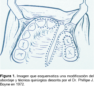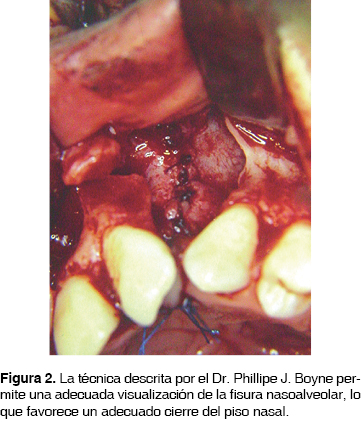 Fue en la década de los 70 donde la reconstrucción secundaria de las fisuras nasoalveolares retoma su importancia con la publicación en 1972 ''Injertos óseos secundarios en hendiduras alveolares y palatinas'' por los cirujanos Phillipe J. Boyne y N.R. Sands, en donde se reafirman los conceptos de la reconstrucción secundaria de FNA y se da a conocer una técnica (Figura 1) que permite, entre otras ventajas, un adecuado cierre del piso nasal debido a la disección de la mucosa nasal de la bucal (Figura 2), así mismo la aplicación de un volumen más considerable de tejido óseo (Figura 3) logrando una mejor expectativa hacia los objetivos de los INA, mismos que serán comentados posteriormente. Por lo anterior, esta técnica es considerada como parte del protocolo de tratamiento de las FNA con INA en el presente estudio.