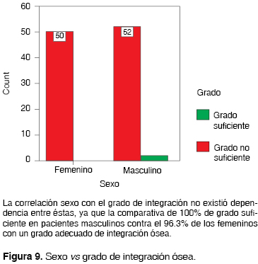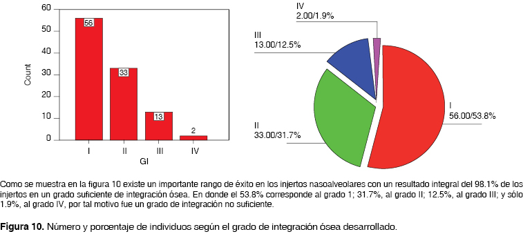 El total de injertos que presentaron un grado suficiente o funcional de integración ósea (grados I, II y III) corresponden al 98.07% (102) y el restante 1.98%(2) a aquellos injertos que no desarrollaron un grado suficiente de integración ósea (grado IV). Estos dos casos en donde el injerto se considera no suficiente, fueron consecuencia de la patología rinosinusal (rinosinusitis).
