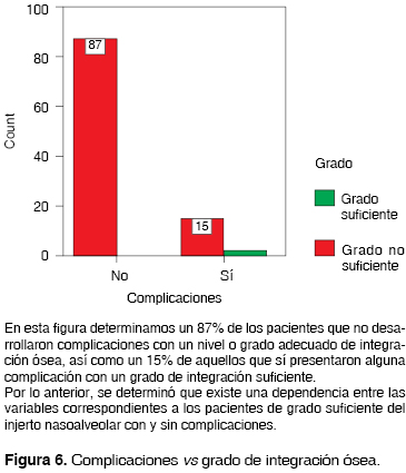 En lo que respecta al presente estudio, el desarrollo de complicaciones en los INA se clasificaron en dos grupos: aquellos que a pesar de la complicación desarrollaron un grado suficiente o satisfactorio de integración ósea y los que no lo desarrollaron. Su diferencia fue estadísticamente significativa.