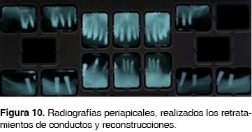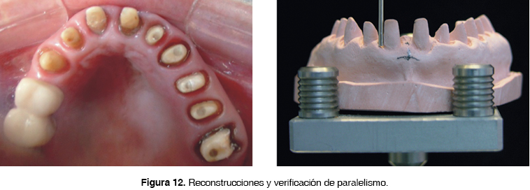 Los postes cementados fueron reconstruidos con otra resina de cuerpo pesado Multicore HB (Ivoclar Vivadent) y conformados con la guía de reconstrucción en acetato (Figura 10).