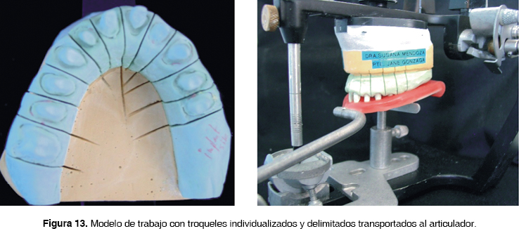 El laboratorio dental protésico, EPS Laboratorio Denta l, mandó modelos de trabajo para llevar a cabo el transporte al articulador semiajustable Hanau . También incluyó unas guías en resina acrílica termocurable para el registro de la céntrica y dimensión vertical (Figuras 13 y 14).