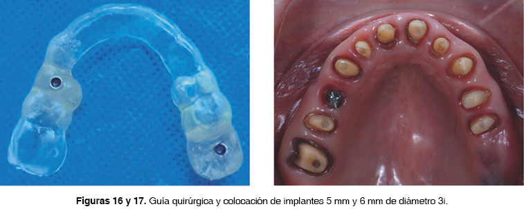 Durante esta fase, el diente 14 presenta una reacción periapical, por lo cual se decide conjuntamente con el Departamento de Periodoncia la colocación de un implante de carga inmediata y la colocación del implante en zona molar del 26 también de carga inmediata 3i . Se elabora una guía quirúrgica restringida (Figura 16 y 17)