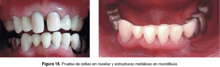 Se probaron en maxilar las cofias de resina para la elaboración de coronas en zirconio Procera ® y en la mandíbula se probó la subestructura metálica para dos prótesis fijas implantosoportadas con cantiliver mesial en ambas. Las cofias de resina en zona anterior quedaron ajustadas (Figura 18).