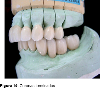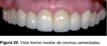 Regresó el laboratorio la prueba de biscocho, se hacen correcciones protésicas: forma y oclusión para finalmente mandar a glasear y cementar todas las coronas Procera ® con Relay X Unicem (3M ESPE) (Figura 19).