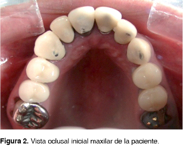 En la exploración dental, la paciente presentaba: ausencia de los dientes: 18, 17, 27, 28, 33, 34, 35, 36, 38, 44, 45, 46 y 48. Tenía aproximadamente 5 años de haberse colocado en los dientes 15, 14, 13, 12, 11, 21, 22, 23, 24, 25, 31, 42 y 43 coronas individuales de metal-porcelana y en el diente 16 una onlay metálica. En caras oclusales de 37 y 47 amalgamas. En 26 muñón con miracle-mix y en mandíbula una prótesis parcial removible flexible, de mayor tiempo, sin tenerse datos exactos (Figuras 1, 2 y 3).