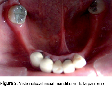 En la mandíbula se observó brecha desdentada clase III de Kennedy con dientes remanentes grado 2 de movilidad, pérdida de soporte óseo e inflamación en zona desdentada (Figura 4).