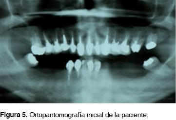 En la ortopantomografía se comprobó ausencia múltiple de dientes, buena relación corono-radicular, pérdida oseamandibular horizontal y vertical, tratamiento de conductos de dientes maxilares y coronas desajustadas (Figura 5)