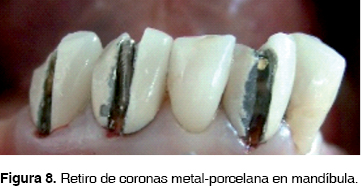 Se retiraron todas las coronas metal-porcelana existentes 15, 14, 13, 12, 11, 21, 22, 23, 24, 25, 31, 42 y 43 junto con los postes metálicos. Se provisionalizó con resina acrílica autopolimerizable Jet Tooth Shade de Lang ® sin modificar dimensión vertical existente y forma, cuidando el ajuste y arquitectura gingival (Figura 7 y 8)