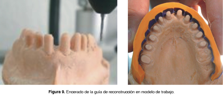 Para la guía en el modelo de yeso piedra Elite Rock tipo 4 Zhermack se enceraron todas las reconstrucciones y por medio de una microfresadora eléctrica ( Microfresadora APF 450 ), se fue dando el paralelismo adecuado para la inserción de futuras coronas, posteriormente se obtiene una guía de acetato flexible para provisionales (Figura 9).