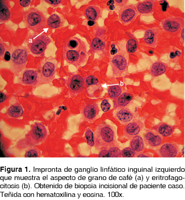Microscópicamente la lesión aparece como un granuloma de color amarillento, observándose células semejantes a las CL normales, es decir, mononucleares, de 15 a 25 μm de diámetro, citoplasma moderado, eosinófilo pálido, núcleo central o algo excéntrico, reniforme con una hendidura o pliegue de la membrana nuclear dándole un aspecto de ''grano de café''10 y en ocasiones puede existir eritrofagocitosis11 (Figura 1).