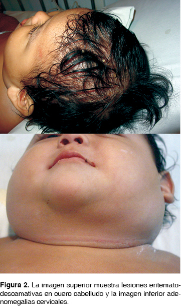 A la exploración física destacó la presencia de lesiones cutáneas eritemato-descamativas en cuero cabelludo, adenomegalias en región cervical y parotídea de 3 cm3, indurado y doloroso a la palpación, sin calor ni rubor, exudado sanguíneo-purulento de oído derecho, epistaxis y olor fétido generalizado del paciente (Figura 2).