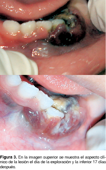 A nivel del órgano dentario 7.2 y donde hará erupción el órgano dentario 7.3 se observó aumento de volumen de 3 cm3, de color violáceo con áreas de necrosis y friable, extendiéndose a fondo de saco y porción lingual de dicha región. Además presentaba halitosis (Figura 3).