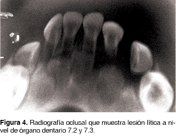 Se realizó una radiografía oclusal inferior, apreciándose en ésta un área radiolúcida bien circunscrita a nivel de órganos dentarios 7.2 y 7.3, no existiendo trabeculado óseo ni formación radicular de dichos órganos dentarios; dando una apariencia de ''dientes flotantes'' (Figura 4).