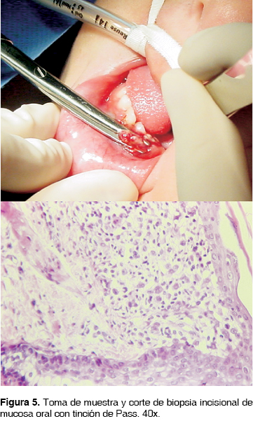 Posteriormente en quirófano se resecó el ganglio inguinal izquierdo y se tomó biopsia incisional en la lesión de mucosa bucal para su análisis histopatológico; diagnosticándose histiocitosis de células de Langerhans con afectación en ganglio inguinal y en mucosa bucal (Figura 5).