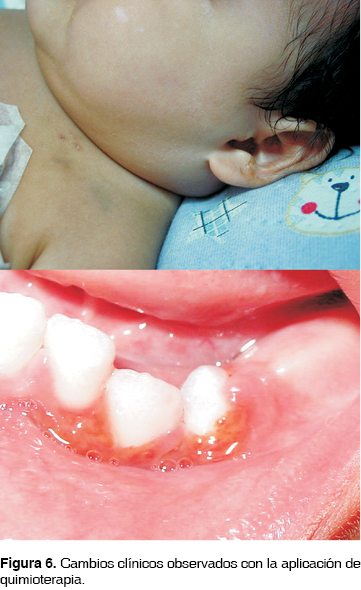 Otro aspecto clínico relevante en comparación con el artículo citado es que, el paciente presentó una lesión en la cavidad bucal. Observándose como características clínicas: movilidad anormal de los órganos dentarios afectados, erupción prematura de OD 7.3, aumento de volumen en dicha región, con aspecto sucio, friable y con áreas de necrosis. Dicha lesión, según las estadísticas que se describen en el artículo mencionado, no es frecuente.