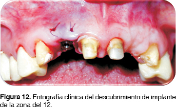 En mayo 2008 se colocaron implantes marca Biolok® en zonas de 35, 36, 37, 46, 47, en todos los casos el diámetro de los implantes fue de 4 mm y un implante postextracción de la zona del 12, (Figura 10), donde se realizó extracción atraumática con periótomos y se colocó xenoinjerto. Con la intención de sobrecorregir el defecto y ganar tejido blando se colocó injerto de tejido conectivo en zona del 12. Y se tomó muestra del hueso regenerado por medio de una trefina para estudio histológico en zona de molares inferiores derechos (Figura 11).