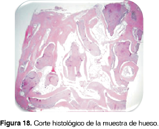 Seis meses posteriores, se colocaron los implantes obteniendo una excelente fijación primaria. En este momento se tomó una muestra de hueso, para estudio histológico; en donde se puede observar la presencia de hueso laminar vital, zonas basófilas de estructuras óseas necróticas, tejido conectivo es fibroso denso, bien vascularizado; que es comparable con lo mencionado por Artzi, que observó en todas sus muestras histológicas obtenidas de casos de aumento de reborde con mallas de titanio, la formación de nuevo hueso, en diferentes estados de remodelación y maduración; partículas de hueso injertado en contacto directo con nuevo hueso y tejido conectivo.13