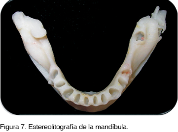 Se obtuvieron fotografías clínicas (Figuras 1, 2 y 3), modelos de estudio, ortopantomografía (Figura 4); así como tomografía axial computarizada (Figuras 5 y 6) y estereolitografía de mandíbula (Figura 7).
