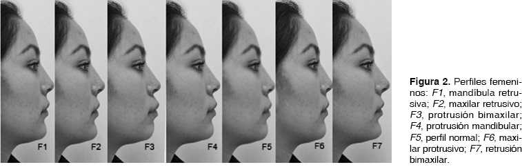 Fotografías de los perfiles de mujeres y hombres mexicanos con Clase I y valores cefalométricos normales fueron escaneados usando Dolphin imaging and graphics®. Los cefalogramas laterales de 2 sujetos tomados con postura natural fueron escaneadas usando Dolphin imaging and graphics®. El cefalograma lateral y las imágenes de perfil de cada sujeto fueron ajustadas usando una simulación de análisis-computarizado para cirugía ortognática. Las imágenes originales son M4 de la figura 1 y F5 de la figura 2 con sus respectiva cefalometría lateral, las cuales fueron usadas para generar otras 6 imágenes manipuladas, alterando valores normales de tejido duro en al menos 2 desviaciones estándar. Las imágenes del perfil facial fueron digitalmente manipuladas en el plano anteroposterior con pequeños o sin cambios en el plano vertical. Esto fue para que cada perfil generado tuviera una proporción vertical normal. Estos 7 perfiles se utilizaron para el posible crecimiento de variaciones maxilares y mandibulares, así como un perfil con protrusión bimaxilar típico en sujetos mexicanos y el perfil con retrusión bimaxilar, que es el perfil recto típico en sujetos blancos. Cada imagen tenía solamente un componente dental o esqueletal manipulado. Los perfiles femeninos y masculinos mexicanos son los siguientes: M1 y F3 (protusión bimaxilar) representan perfiles con un grado avanzado de segmentos alveolares maxilar y mandibular con incremento maxilar y mandibular de inclinación incisal produciendo protusión del labio superior e inferior sin alterar la profusión anteroposterior de la mandíbula. M2 y F4 (protusión mandibular) representa perfiles con desarrollo únicamente mandibular. M3 y F1 (retrusión mandibular) representa perfiles con posicionamiento posterior solamente mandibular. M4 y F5 (perfil normal) representaba perfiles mexicanos con relación basal Clase I esqueletal y Clase I incisal con promedio de valores normales cefalométricos. Ellos fueron usados como plantillas en los que los otros 6 perfiles derivaron. M5 y F2 (retrusión maxilar) fueron perfiles digitalmente construidos con posicionamiento posterior solamente maxilar. M6 Y F6 (profusión maxilar) fueron digitalmente construidos con desarrollo anterior solamente maxilar. M7 y F7 (retrusión bimaxilar) fueron digitalmente construidos para representar perfiles planos con incisivos maxilares y mandibulares derechos y menor protrusión anterior de los segmentos alveolares de acuerdo con rasgos del perfil blanco.