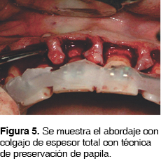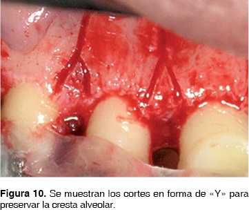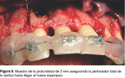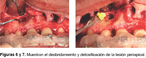 Bajo anestesia local en la zona palatina y vestibular, de premolar a premolar (15-25) se realizó un colgajo de espesor total utilizando la técnica de preservación de papila (Takei 1984)17 donde se realizaron incisiones semilunares en la base de la papila palatina seguida por incisiones intrasurcales sin involucrar tejido blando interproximal, posteriormente se desplazó el colgajo de palatino a vestibular (Figura 5). Se ubicó la lesión periapical en el diente 12, nos percatamos de la presencia de una fenestración en el diente 23. Se desbridó la lesión y se biseló el ápice de la raíz con una fresa de diamante, se detoxificó el defecto con tetraciclina disuelta en solución fisiológica (Figuras 6 y 7). Se inició la corticotomía con cortes verticales (Figura 8) entre las raíces con una profundidad aproximada de 2 a 3 mm con el propósito de llegar al hueso medular, se efectuó un corte formando una ''Y'' para dejar intacta la cresta alveolar (Figuras 9 y 10).3
