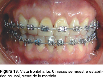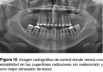 El control se llevó a cabo cada mes, hasta cumplir siete meses momento en el que se termina el tratamiento. La cicatrización y el postoperatorio ocurrió aceptablemente bien y sin alteraciones en los tejidos periodontales; conforme avanzó el tratamiento ortodóncico se observaron clínica y radiográficamente los cambios favorables en las posiciones de los dientes, tanto en una vista oclusal, como lateral se constataron cambios positivos en la posición de los dientes llegando así a lograr la retroinclinación de los dientes anteriores y el cierre de la mordida anterior así como una armonía oclusal con resultados estéticos aceptables (Figuras 13 a 15)(14). A los 7 meses de evolución existe un llenado óseo en la zona del ápice del diente 12 y sin afectación radicular de los ápices de los dientes involucrados en la corticotomía (Figura 16).