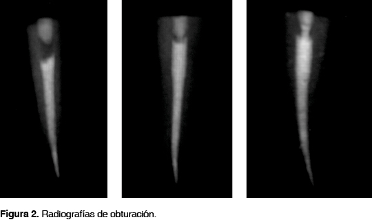 El grupo 1 se obturó con la técnica de compactación termomecánica de McSpadden. Para esta técnica, se calibró una punta de gutapercha M hasta que ajustara dentro del conducto. Se colocaron una o dos puntas de gutapercha accesorias FM según lo permitiera el conducto y se introdujo un obturador termomecánico (Moyco, M.R.) a una velocidad de 8,000 rpm con alto torque, activado por medio de un motor eléctrico con control de velocidad y torque (VarioSurg NSK, Japan, MR), hasta que se obturara completamente el conducto. En el extremo cervical se colocó una torunda de algodón y Provisit como obturación temporal. El grupo 2 se obturó con la técnica de Schilder. Se calibró al tamaño del conducto una punta de gutapercha M (Hygienic) mediante una regla calibradora de puntas de gutapercha (Mailefer MR), la cual fue calentada dentro del conducto con la ayuda del Touch n'Heat (Sybron Endo, Sybron Dental Specialties, MR) y compactada en el tercio apical con la ayuda de compactadores de Schilder (Mailefer MR). Otra punta de gutapercha M fue seccionada en partes de 4 mm cada una, las cuales fueron introducidas en el conducto de igual manera con ayuda del Touch n'Heat y compactadores de Schilder de mayor calibre, hasta completar la obturación del tercio medio y cervical. En el extremo cervical se colocó algodón y Provisit como obturación temporal. El grupo 3 fue obturado con técnica Thermafil. Se utilizó un calibrador de conducto del sistema para conocer el diámetro del conducto. Una vez elegido el tamaño adecuado, se introdujo el obturador dentro del conducto con una presión constante; una vez que estuvo bien asentado, se procedió a eliminar el resto del vástago que salía del conducto con una fresa de bola, se realizó una compactación vertical ligera y se colocó una torunda de algodón y Provisit. Se tomaron radiografías de cada uno de los dientes posterior a su obturación (Figura 2).