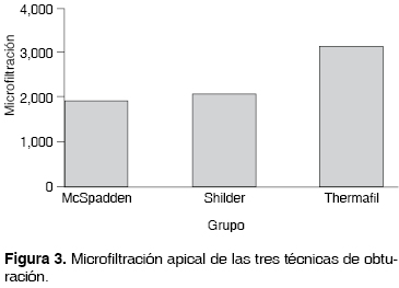 El grupo 1 (McSpadden) presentó una media de 1,934.40 μm, con una desviación estándar de 726.566; el grupo 2 (Schilder) presentó una media de 2,083.20 μm, con una desviación estándar de 1,328.713; por último, el grupo 3 (Thermafil) presentó una media de 3,134.40 μm, con una desviación estándar de 877.247 (Cuadro II).