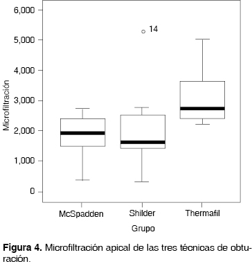 Posteriormente se aplicó un análisis de varianza no paramétrico, prueba de Kruskal-Wallis, para comprobar el resultado anterior, dando como resultado que z = 9.094 y p = 0.011, por lo que de igual manera se obtiene como resultado que existe diferencia estadísticamente significativa de la cantidad de microfiltración de Thermafil, con respecto a McSpadden y Schilder, presentando la primera, una mayor microfiltración (Figuras 3 y 4).