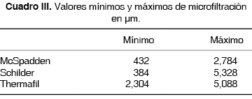 El valor mínimo del grupo 1 fue de 432 y el máximo de 2,784 μm de microfiltración, el grupo 2 presentó un valor mínimo de 384 y un valor máximo de 5,328 μm; por último, el grupo 3 tuvo un valor mínimo de 2,304 y su valor máximo fue de 5,088 μm (Cuadro III).