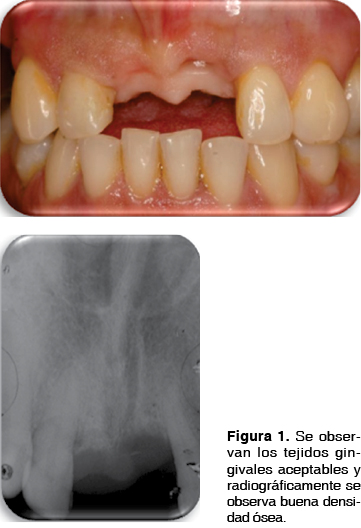 Se presentó en la clínica de Periodoncia de la División de Estudios de Postgrado e Investigación de la Facultad de Odontología de UNAM un paciente femenino de 47 años de edad, sin antecedentes sistémicos aparentes para su condición actual y que presenta un diagnóstico periodontal clínico de periodontitis crónica localizada, presentando ausencia de los incisivos centrales superiores a consecuencia de un traumatismo, por lo que la paciente refiere mayor importancia en cuanto a su apariencia estética (Figura 1). Se realizó una evaluación clínica y radiográfica intraoral para valorar todos los parámetros ya establecidos para la colocación de los implantes. Se seleccionaron los implantes y se procedió a colocarlos en la zona anterior del maxilar realizando el procedimiento quirúrgico mediante el protocolo de Branemark12 para implantes unitarios de carga inmediata.